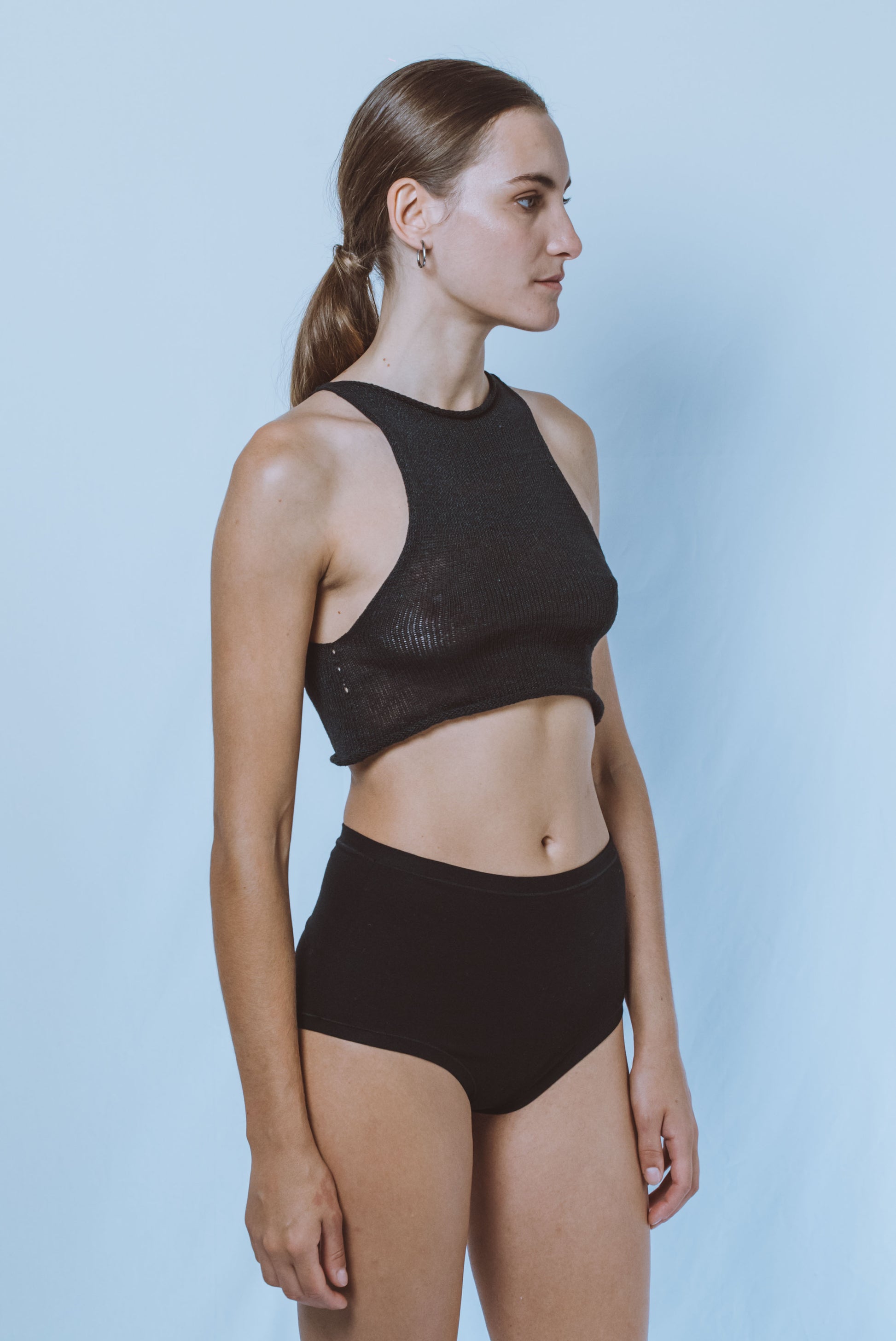 This cropped halter-top is engineered for structural adaptability and ergonomic precision. Crafted from 100% Eri silk, a fibroin-based renowned for its tensile strength, breathability, and thermoregulatory behavior, the garment offers both stability and freedom of movement.